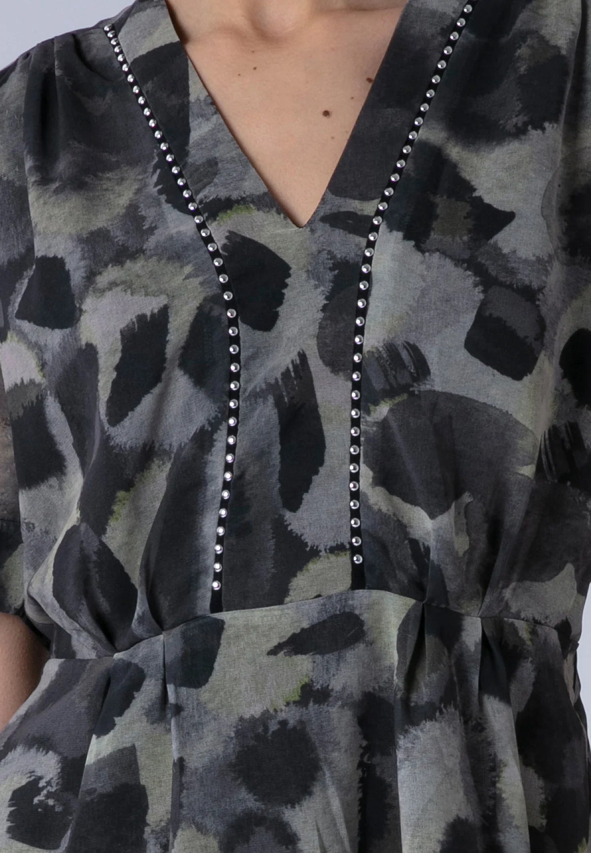 Chic and feminine, the Violet Top features a flattering V neckline accented with subtle stud detailing. With short puff sleeves, a fitted waist, and hip-length cut, it offers a shapely silhouette that transitions effortlessly from day to evening. Finished in our bold floral Camellia print in fresh green tones, and complete with a discreet side seam zip for ease. Style it with the matching skirt for an effortlessly coordinated look. The model wears a size UK 10. Length from the top: 62 cm