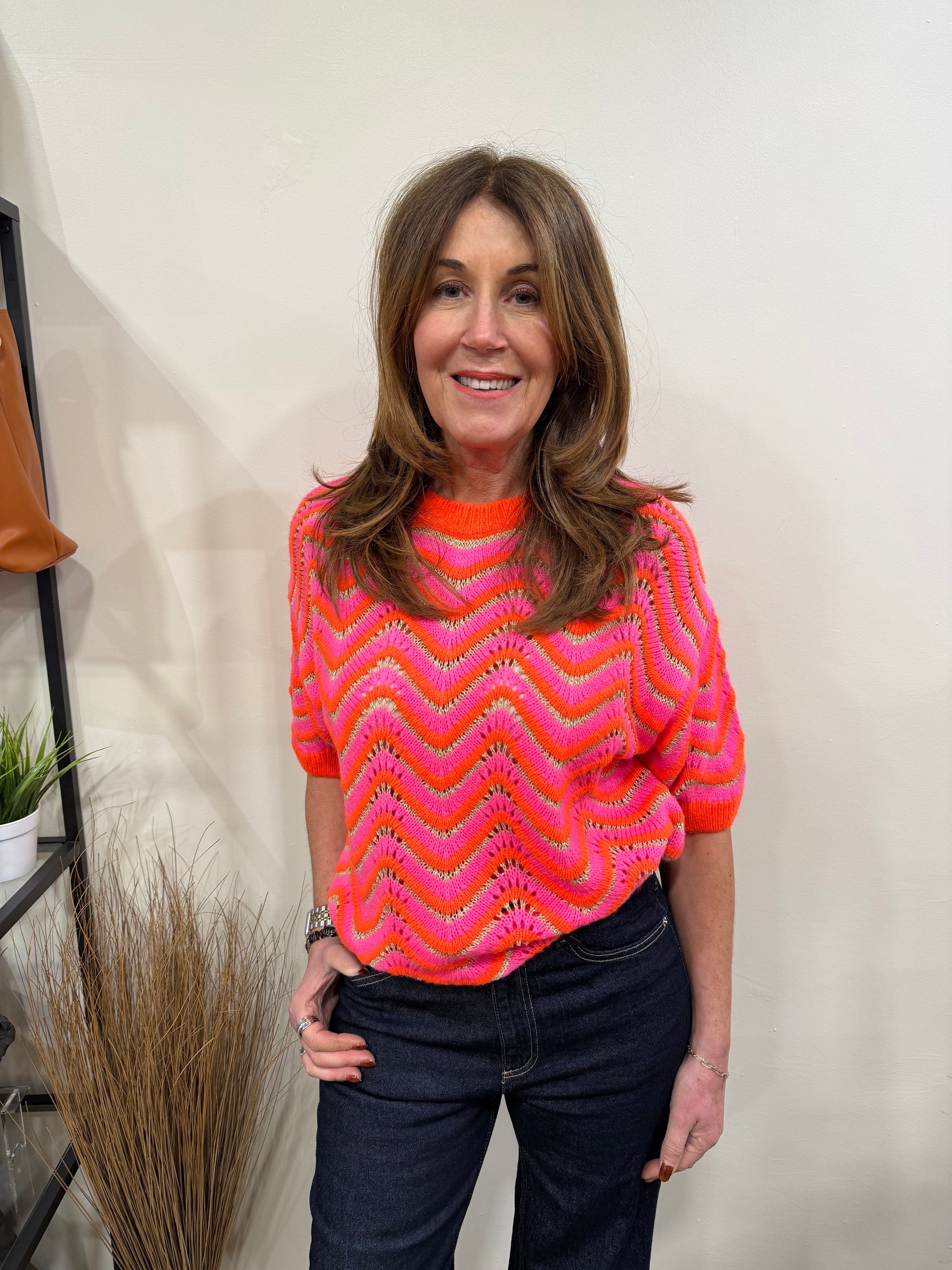 Short sleeve knitted top in a bright neon pink & orange wavy print with a gold lurex thread running through.